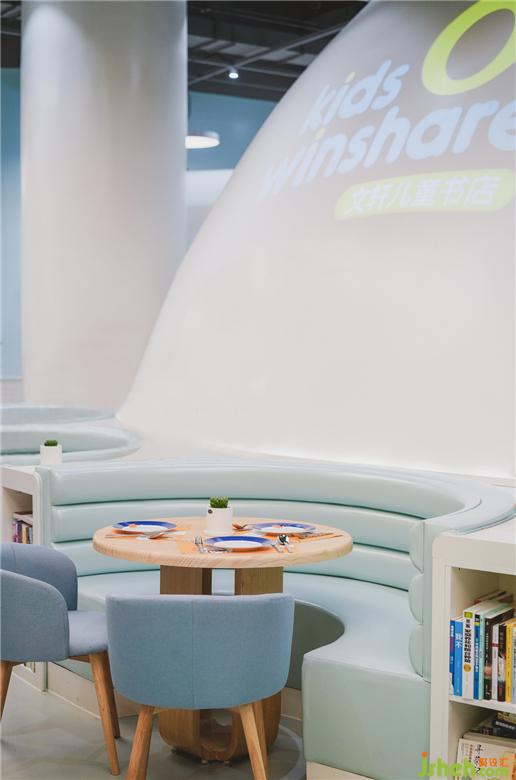 在第一个空间,我们首先见到一个开放式,儿童书店设计由一系列螺旋式黄色和白色的书架蜿蜒展开的阅读区域,摆满了不同类型的图书供不同年纪的读者选取,还有舒适的阅读洞可供家长和孩子休闲使用,透明的椭圆形阅读洞也提供了店面内外的视觉联系。