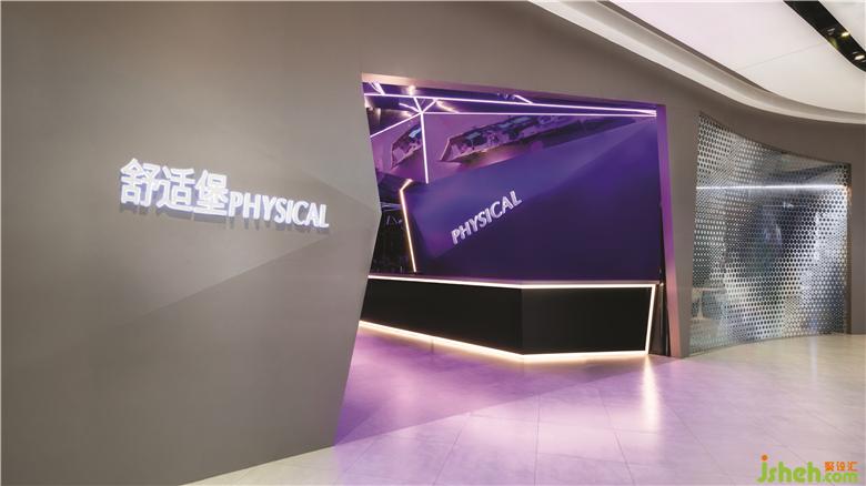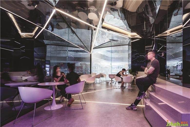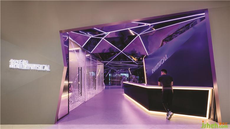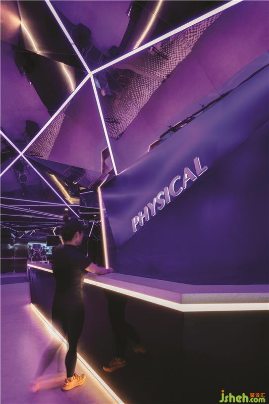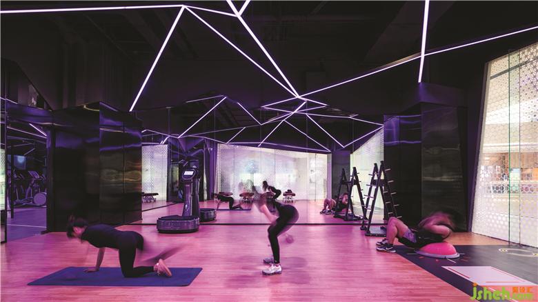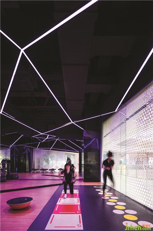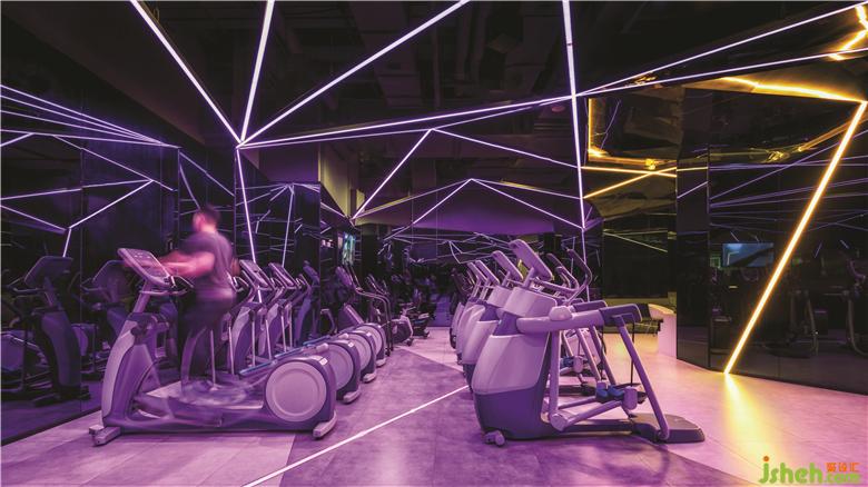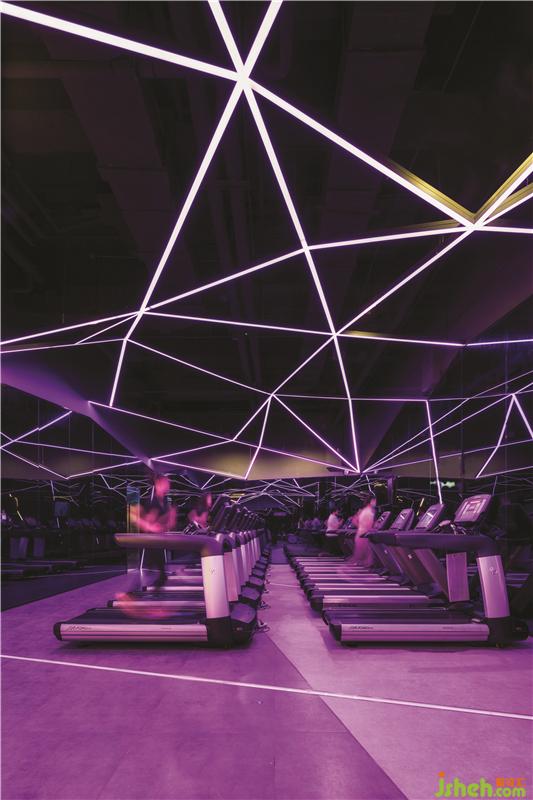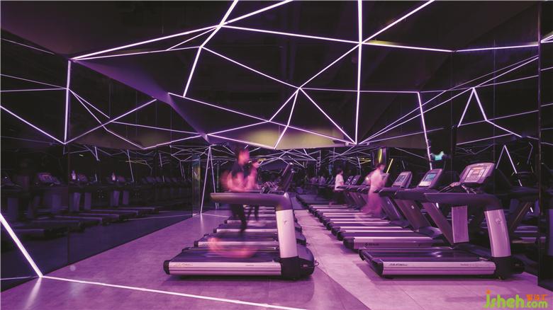 健身中心设计公共器械区是一个炭灰的空间配以多角度天花紫色的LED流动光线,带动客人的姿势和频率与背景音乐相呼应,让他们更集中地进行运动锻炼。