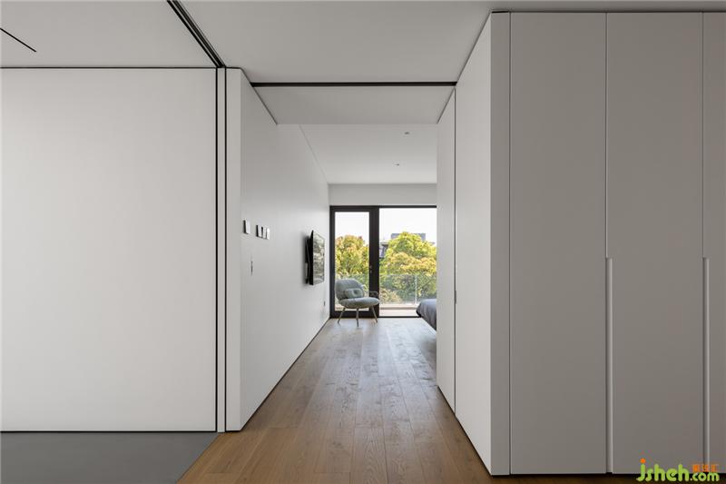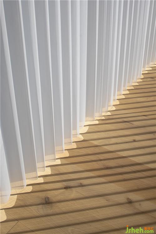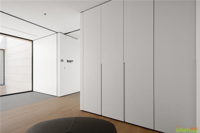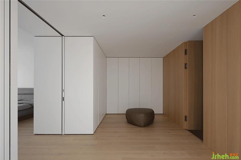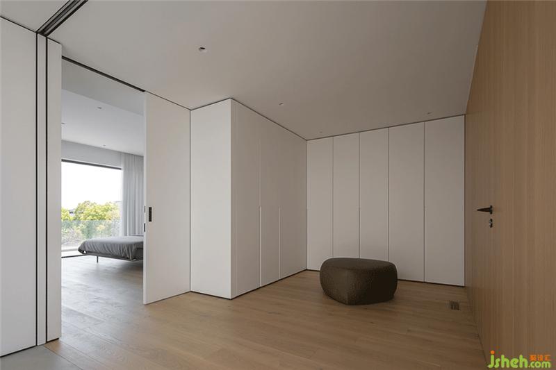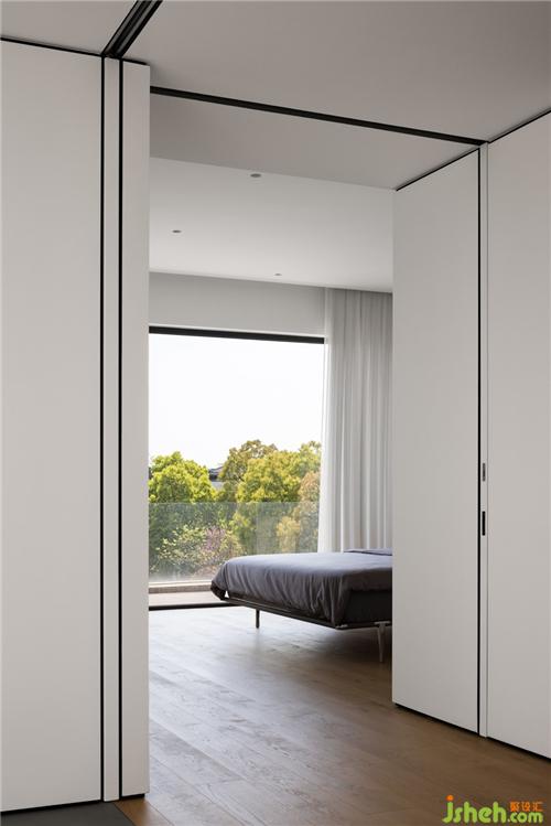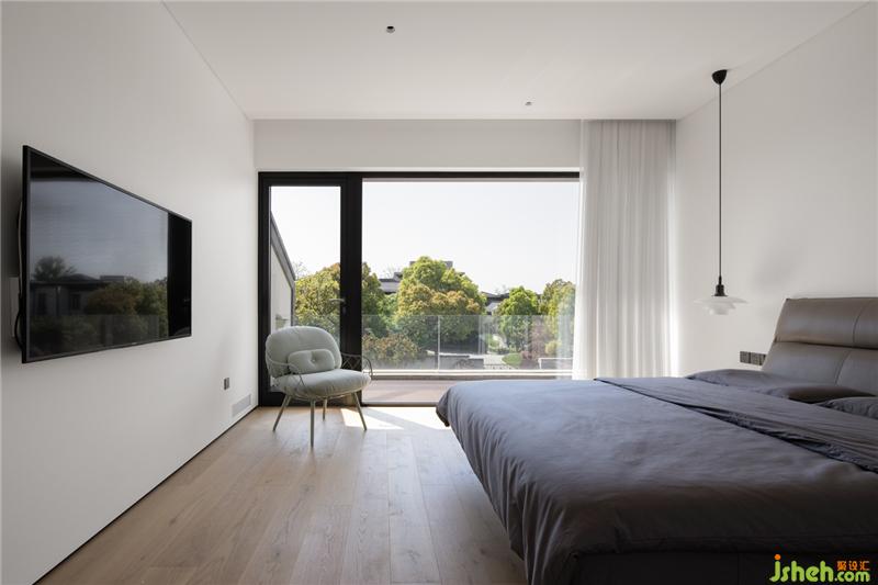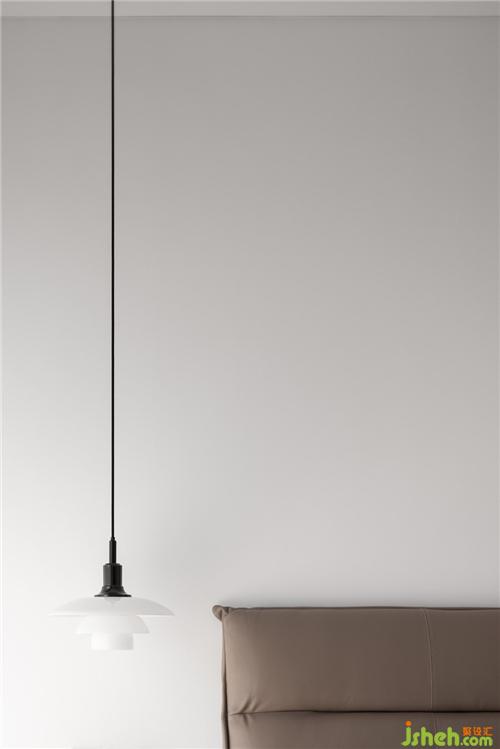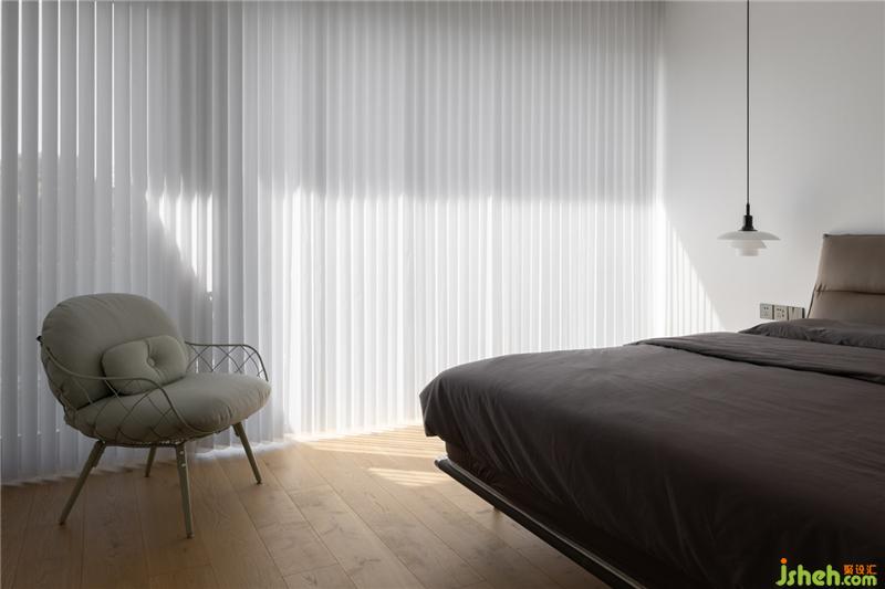 卧室宽大的床上摆放着舒适的床上用品,波浪条纹的窗帘隐隐约约透过光,设计简洁的吊灯从顶部垂到床边,一个抽象的衣架立在床边,增加了卧室的艺术气息,一切都显得宁静舒适。