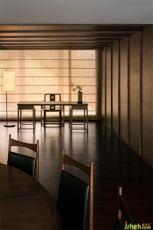 一帘半遮半掩的后院山色袭人,透过玻璃捕捉到山脉另一端的朝阳。观景台纤细柱体阵列延伸至远方与草木相接,廊檐借助顶棚金属板的漫反射,放大户外四时之景,融合室内人物活动。南京会所设计者以拓宽维度的手法,使纤细得以彰显出磅礴之势。此时,观景台由于食客的欣喜而充满暖意,恰如春光融和。