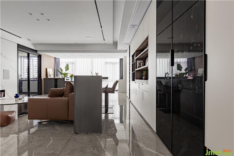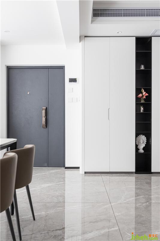 沙发后面安排了一个小书吧,书吧后面一墙的柜体收纳功能只能用“巨大巨实用”来形容。它是鞋柜的补充,更是书柜、同时也是酒柜,精品柜。藏露有度,黑白分明,让家更整洁。