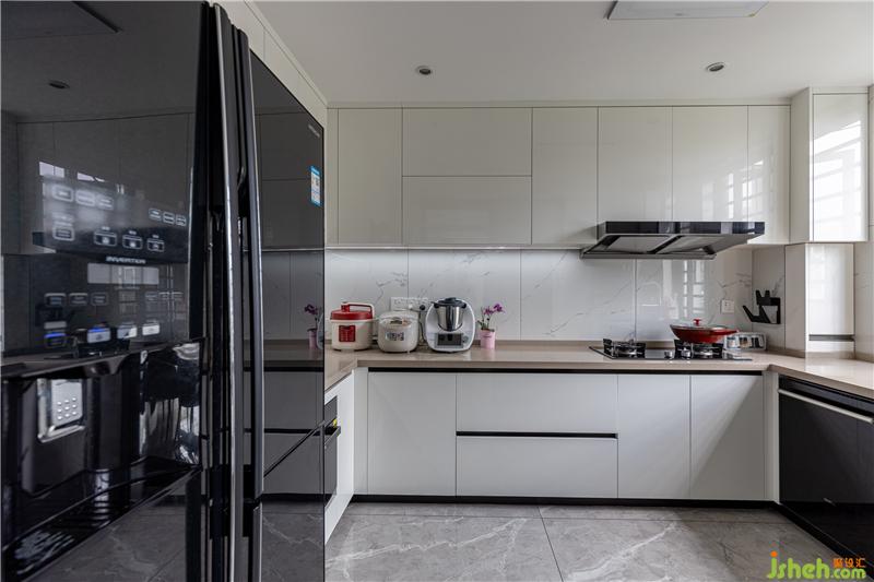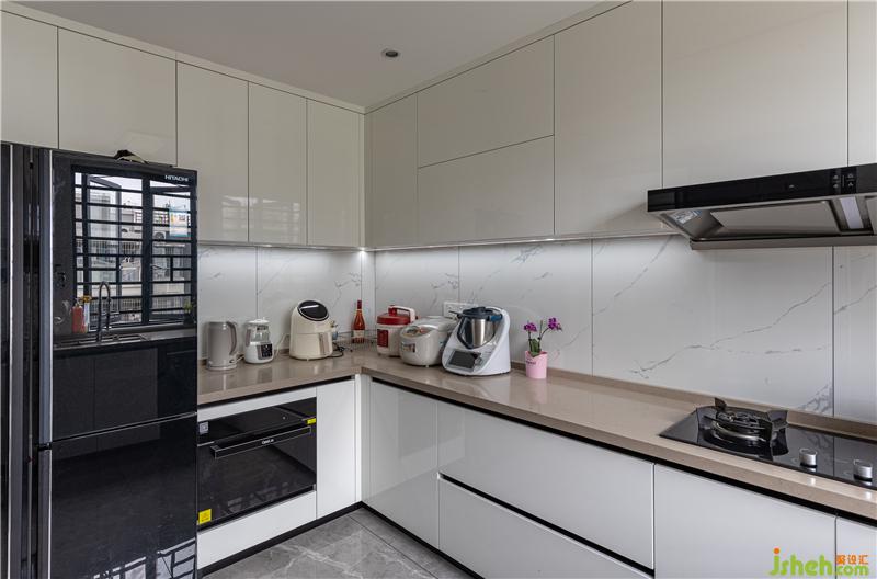 厨房整个就是一个“壕”!干净整洁,所有能嵌入的电器都进入它们该进入的空间内,小电器也有足够的台面可以安家。