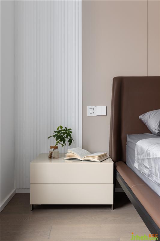 皮质硬包留缝设计的米色床头背景墙搭配一点点白色线条板,简约温馨。有时候给生活留一点白,让未来去添上色彩。