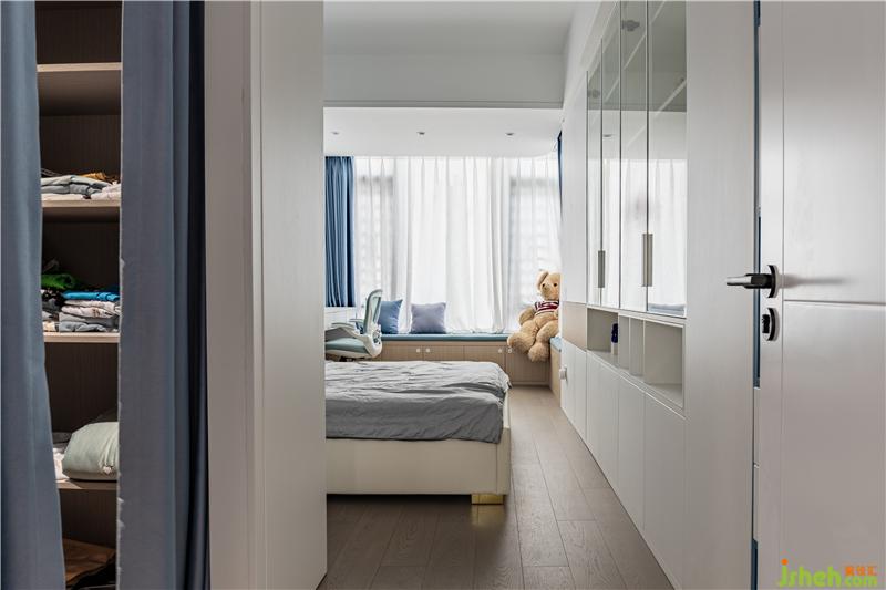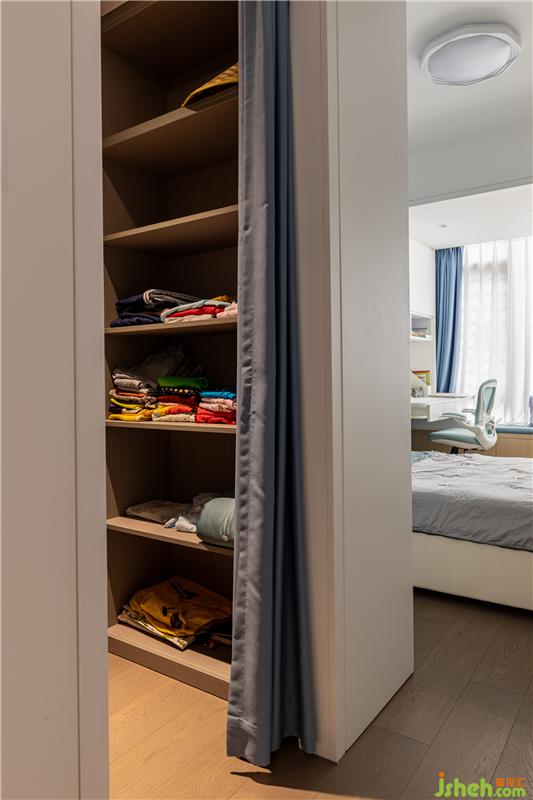 还没走进姐姐的房间,就感到一阵海边的清凉,蓝色是姐姐特别喜欢的颜色,低饱和的莫兰迪色系非常治愈。进门左手边是个开放式衣帽间,这姐姐的房间得有多大厦门家居设计!
