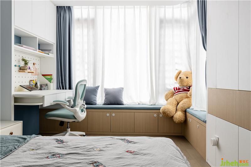 这个房间被阳台占用一部分,但还是留足了活动区域,色彩更丰富活泼了一些,爬梯床下方是妹妹的秘密基地,放满了她的各种玩具。床底下作为补充收纳真的很方便,而且还比榻榻米更加通风。