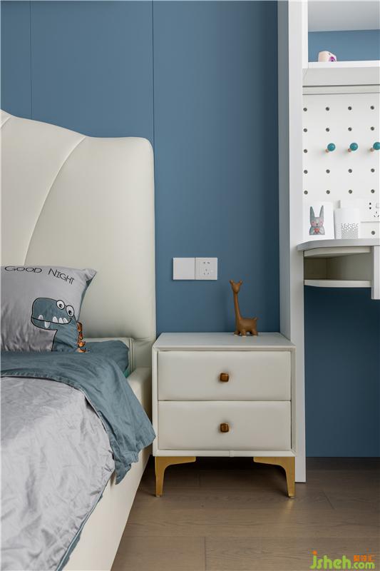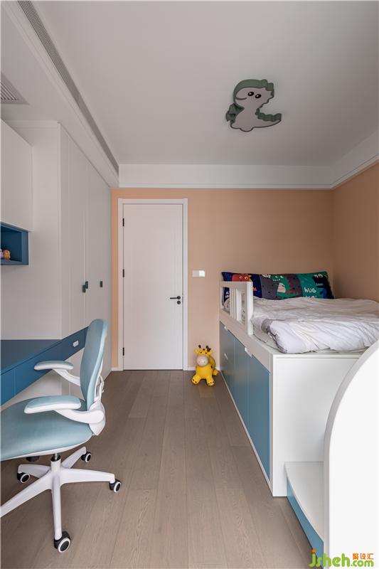 进入妹妹的房间,立刻有种粉嫩活泼的感觉。一组大衣柜藏在门后面,抽屉的蓝色一直延伸至桌面。这个空间也是蓝色的延续!