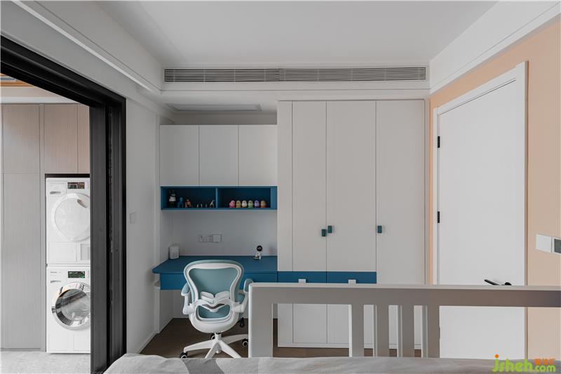 小女儿房的阳台为生活阳台,行政柜将洗衣机烘干机直接包入其中,实用又美观,真的没有浪费一寸
