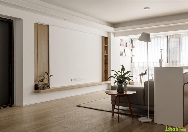 入户没有玄关,左右两边分别是餐厅和客厅。全屋木地板铺设,白+木纹淡淡的日式温馨设计。