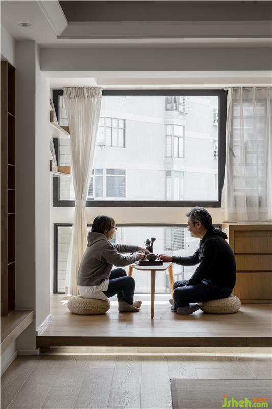 原休闲阳台纳入客厅,抬高一步嵌入灯带,形成相对独立却又融合的第三空间。这里是平时Y女士他们喝茶、健身地方。