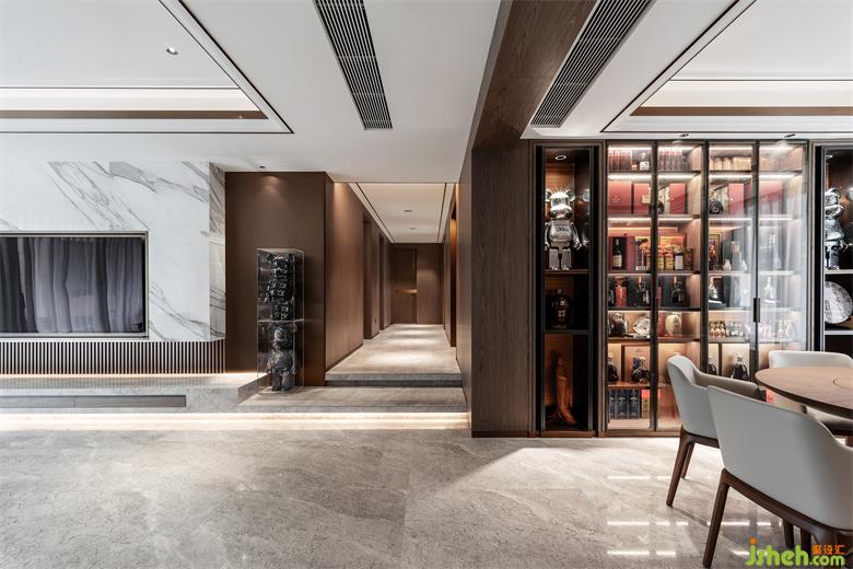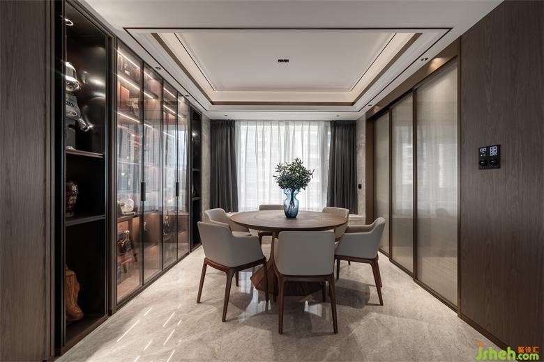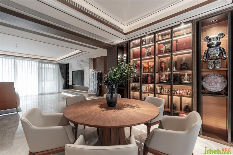 时下比较流行且受欢迎的木饰面客厅背景墙设计,搭配明亮色系沙发,是豪宅酒店常用的设计手法。家装设计客厅连贯着餐厅,空间兼容性强,颜色搭配极佳,呈现出沉稳内敛的空间调性。餐桌椅子皆为浅色系搭配原木的款式,储物柜均采用木色系,显得颇有文化气息,为空间释放不少光泽。