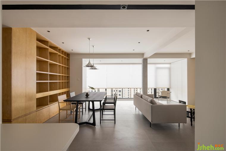 大平层装修设计拆掉了离客厅最近且朝南的房间,调整布局通过客餐厅一体化的直观,得到活动动线上的自由,主背景是木色的转折、连续,时隐时现成为整个空间面的涂底。