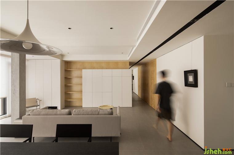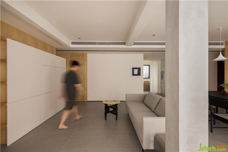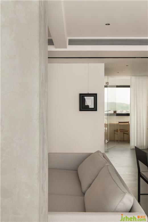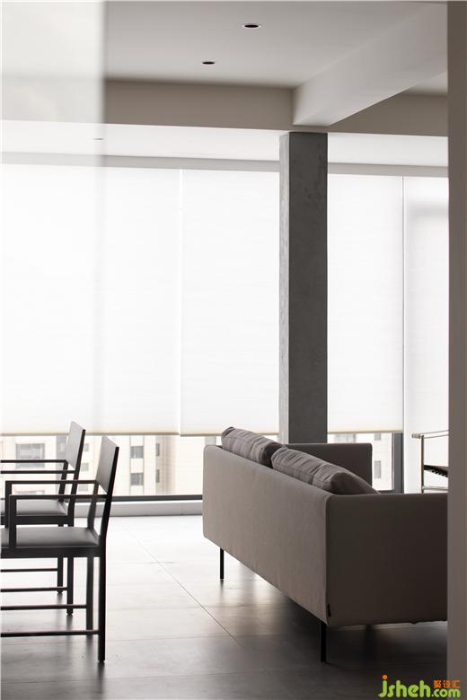 房间的非承重墙体被敲掉后,在公共空间留下了一根布满细钢筋的柱子,大平层装修设计经过粉饰之后意外的有了清水混凝土的效果,伶仃的柱子在这个地带虽是朴素裸露的样子,却成为了室内空间建筑感的来源。
