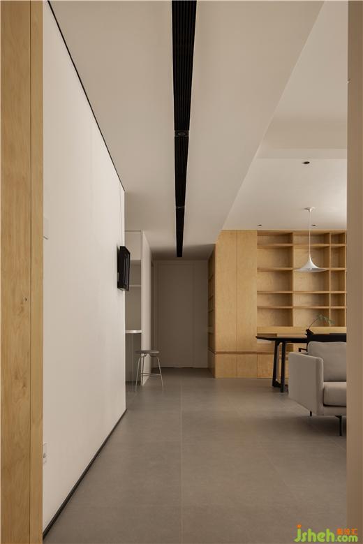 把入户的玄关柜和客厅书柜统一起来做,两个面的转角在空间中产生一种视觉偏差,形成一个独立个体的样子。公共区域的主动线由黑色的空调风口牵引,这条黑线通过路线尽头镜面的二次反射,感官体验被无限的拉长,黑线在头顶渐行渐隐,空间的末端变得小而朦胧。