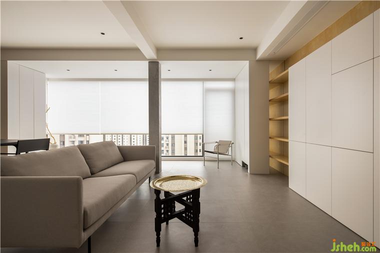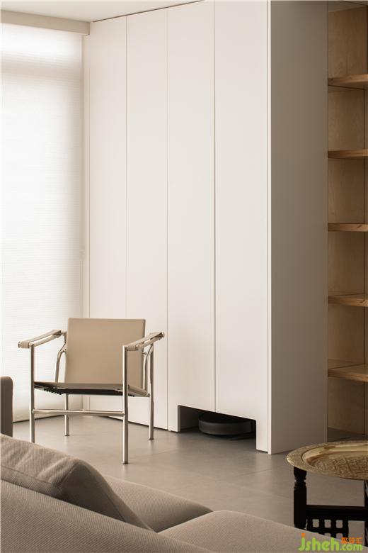 在变大的阳台做收纳,存放家用的一些功能性用具,比如洗衣机、烘干机等,拖地机器人也有专用的“工位”和出入口,这是阳台的功能之处。但更多的空间是用来作为起居空间的“余裕”,引来极佳的光线,也作为视觉和脚步丈量之用。