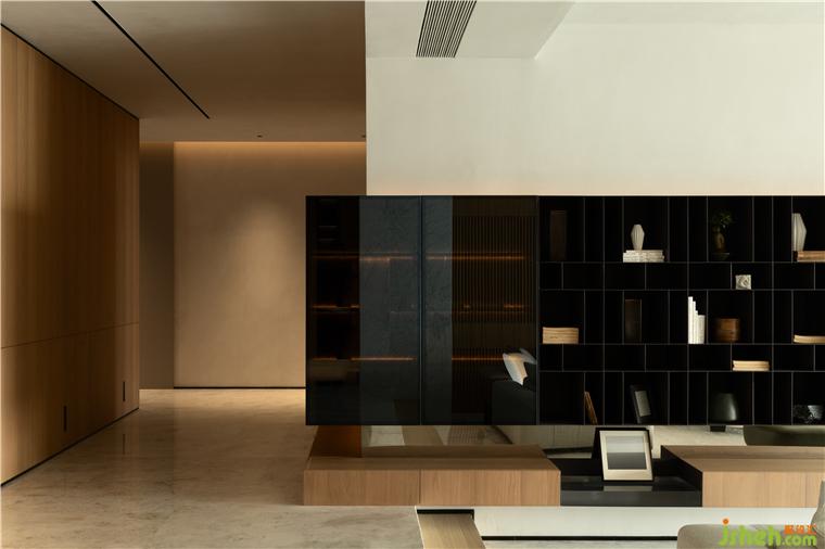 进入主卧套房,并不正对着任何一个功能区,豪宅设计利用走道长度将私密性空间同入口保持着距离,形成勾连内外的仪式感通道,顶面材质引导行走方向,到达可以满足高效学习还有独处需求的书房和睡眠区。