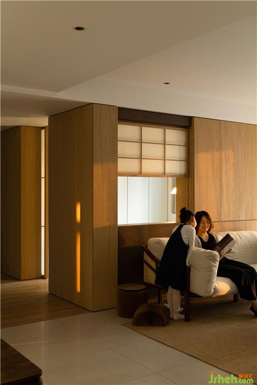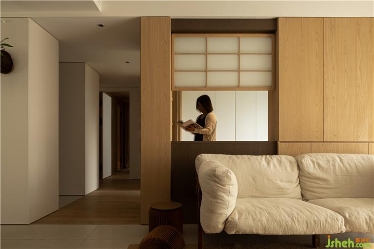 用多个木饰面柜代替不必要的墙体,组合而成的小木屋作为书房及备用房使用,南北向的尺度适当收缩,家装设计让通往私区的走道南移,增强卧室私密性的同时,也巧妙结合了家政区和外卫干区的功能。