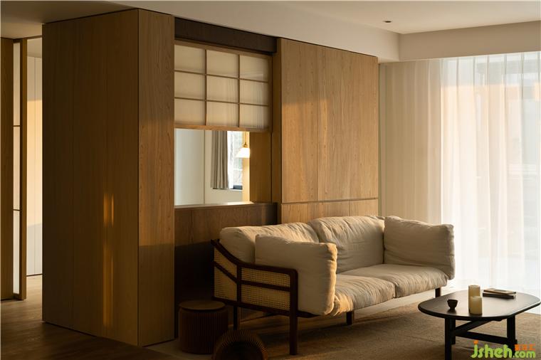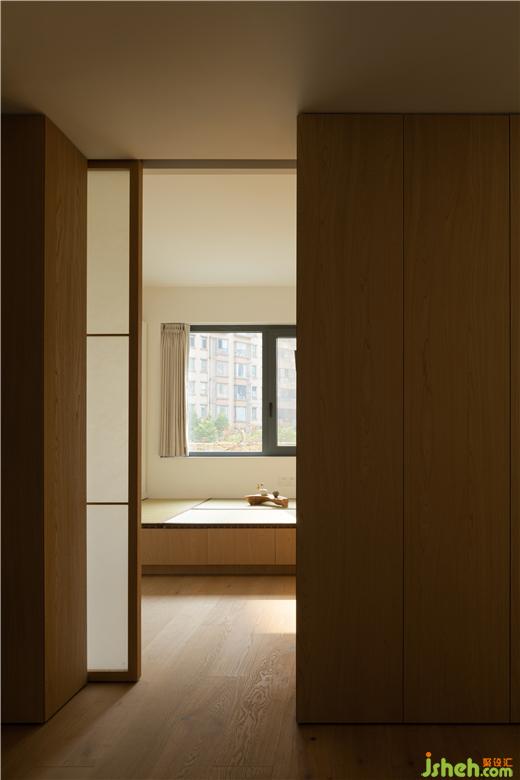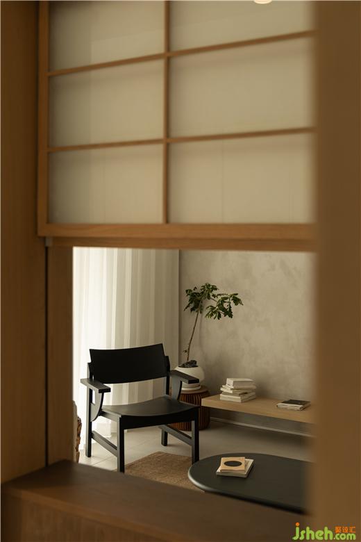 窗扇的开启用了上下推拉的形式,使空间看起来更加通透,又不失隐秘性,格条和夹了和纸的玻璃,家装设计营造出日式风格的佗寂,清幽之感,也晕染了一定的禅意氛围。