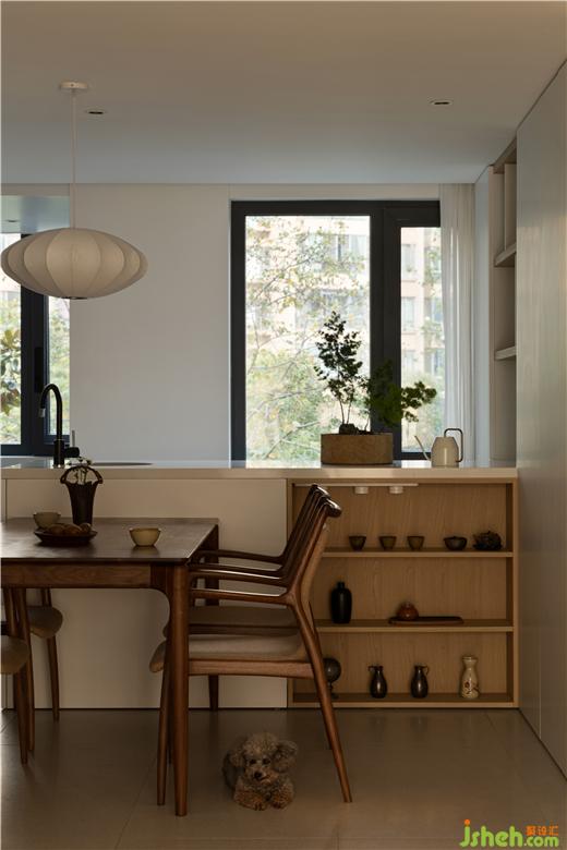原来北边的家政阳台因为功能转移,连同中厨一起被打开,开放式厨房岛台和餐桌的组合,进一步赋予生活场景更多的互动性。