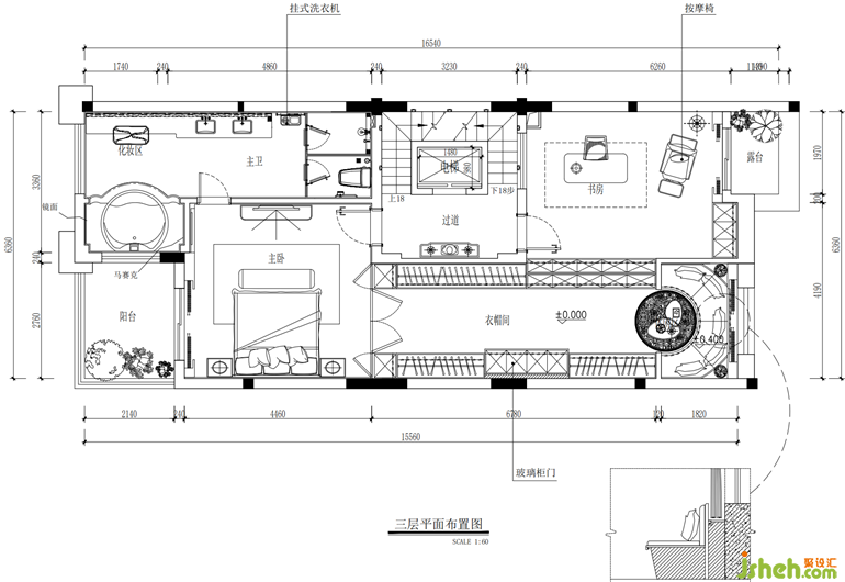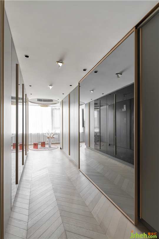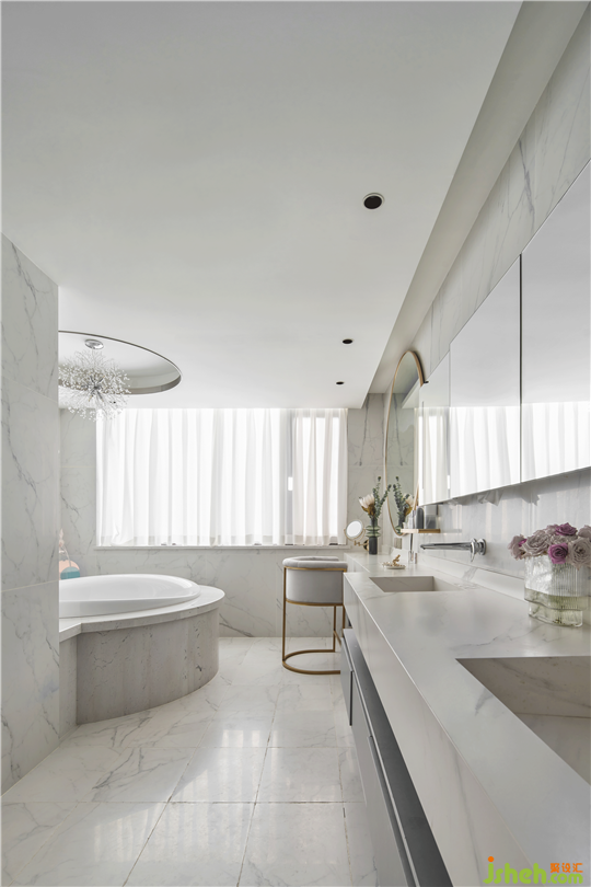 三楼是男女主人的私人空间,套房式的设计,保证了其私密性,也更大限度的满足了男女主人各自的爱好习惯。在交互上,我们也设计了靠窗的环形区域,背靠美丽的山城,男女主人能在这方独属于自己的天地中互诉衷肠。