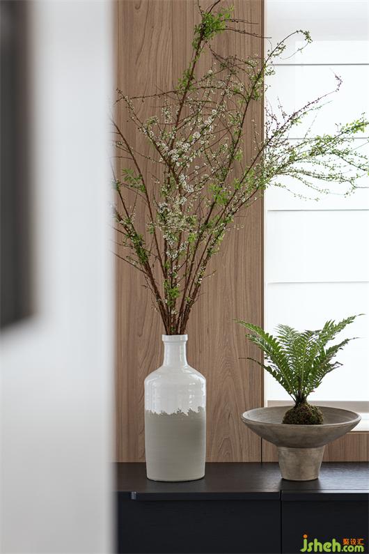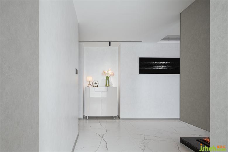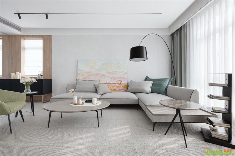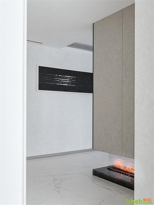 客厅电视墙拆除多余的墙体,做成悬空的电视墙,使得空间更加通透。别墅装饰简洁的材质,大面积灰色背景墙搭配原木,让空间更加舒适。主色调灰白,在各个区域中都有独立的对应色系,精简而规整,大方而得体。