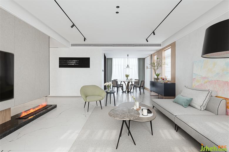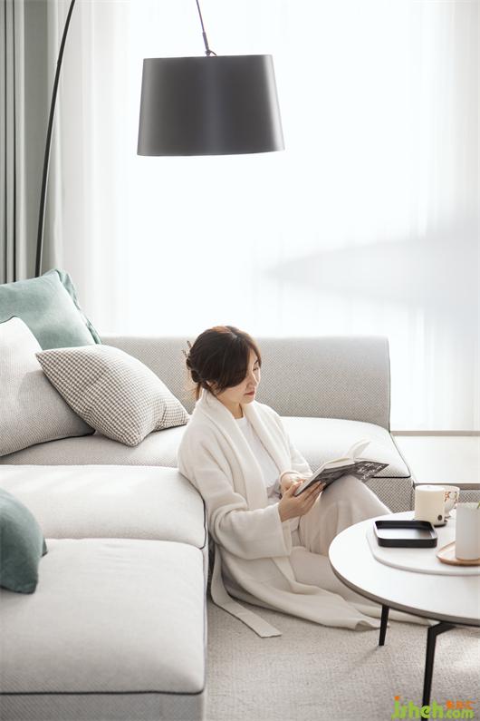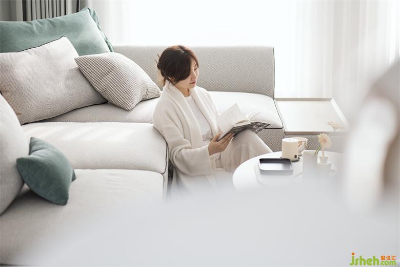 客厅还有一面非常大的落地窗,不管任何天气都拥有最佳的采光。阳光慵懒洒向客厅,没有多余的点缀。空间在静谧深邃的极光绿描摹下,展现出精致而惬意的闲暇时光,生活的节奏被减缓放慢,浮躁的内心也逐渐归于平静。
