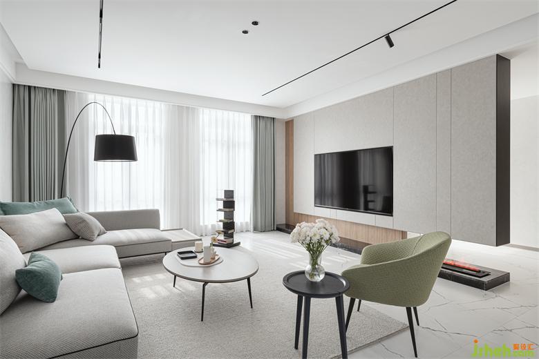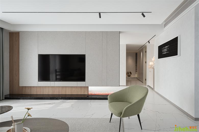别墅装饰整个空间的室内动线紧凑精简,宽阔明亮的起居空间,以包容度高的白色、灰色为基底,局部以软装、艺术品装点个性橄榄绿色调,展现舒适、雅致的居家氛围。