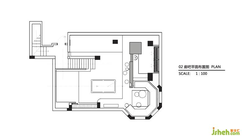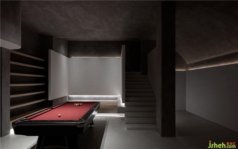地下室为一个方形空间,把廊吧布置与地下室,提供小型聚会和娱乐的功能,室内设计师为打破原先单调的空间,顶面采用弧面系统,同时将墙面上的体块以悬浮的状态呈现,通过切割使原建筑的楼梯成为一个独立的审美体系,增加空间的趣味性。