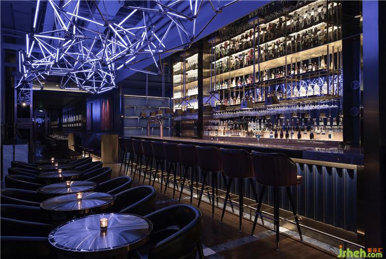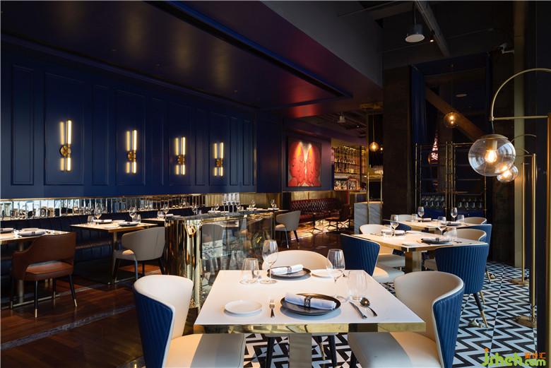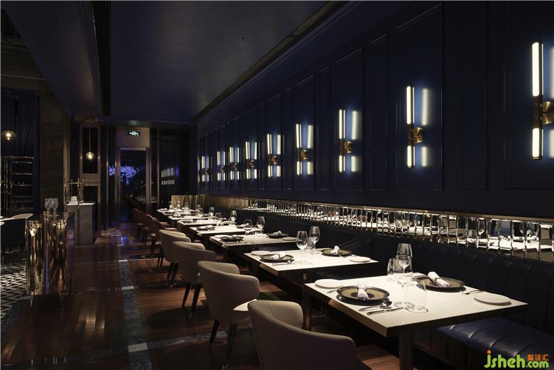 整个建筑呈长条形,近4米高的落地玻璃将黄浦江风景一览无余,根据建筑形态把就餐区依条形布置,将厨房靠后,以此呈现出酒廊的基本空间形态。室内设计师将300m²的酒廊划分为餐区、酒吧、廊吧、厨房四大区域,以蓝色为主基调将几个区域连成一体。