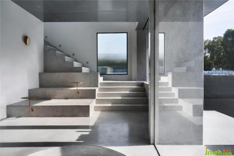 阶梯作为连接三层空间的主要路径,承担着三维坐标轴的角色。长方体块的直向运动呈现阶梯的连续状态,在这个纵向的空间里,装修公司设计了一个镜头状的圆形窗,使这个纵向路径有了横向的视线,同时镜头的形式给窗户的功能带来窥视感,形成趣味性的第二空间体验。