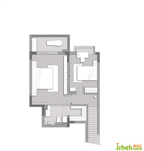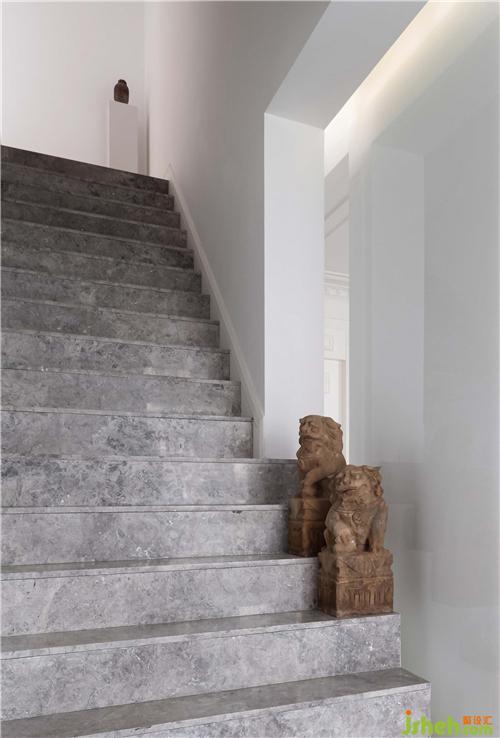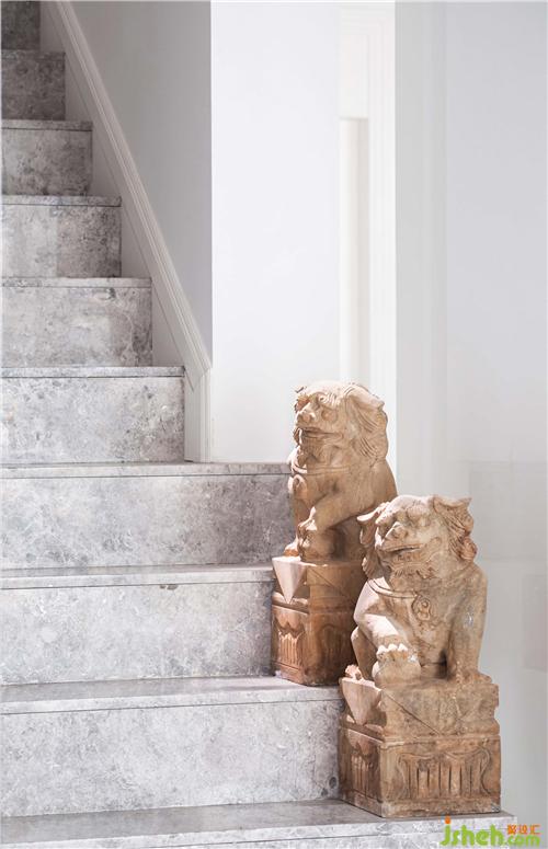 Ascending the stairs, the stairs lead to the owner's resting area on the second floor. In traditional culture, the stone lion is a beast of the town house and a symbol of majesty. The two small stone lions here not only fill the gap in the stairs, but also meet the needs of space furnishings, and cleverly separate the activity area and the bedroom.