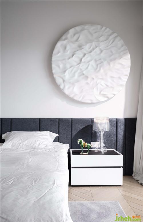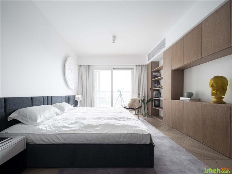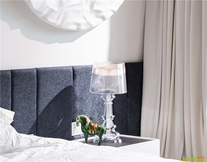 The master bedroom has good ventilation and light, as well as a warm and ironing space relationship. The blue bed body is calmly neutralized by white and wood, and the simple decoration is embellished to create a good sleep texture and human touch, precipitating simple beauty.