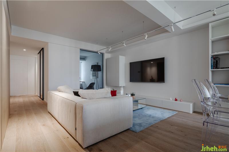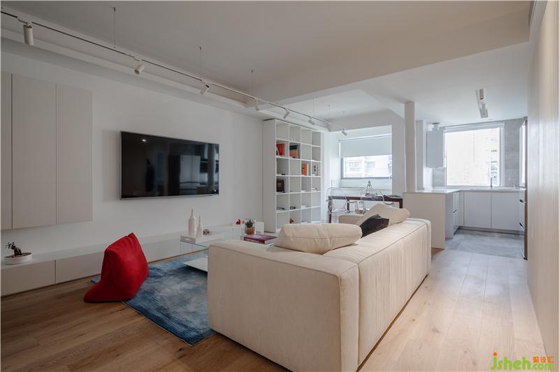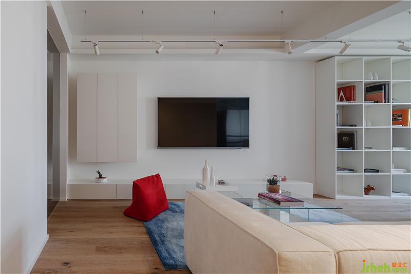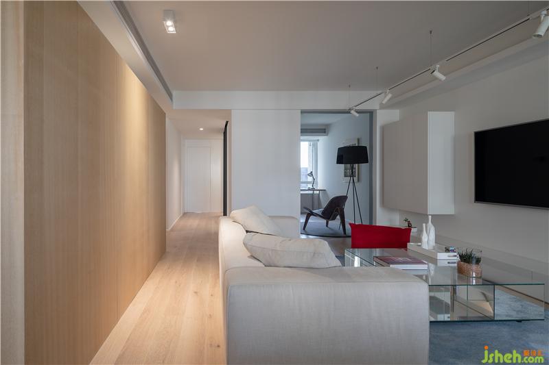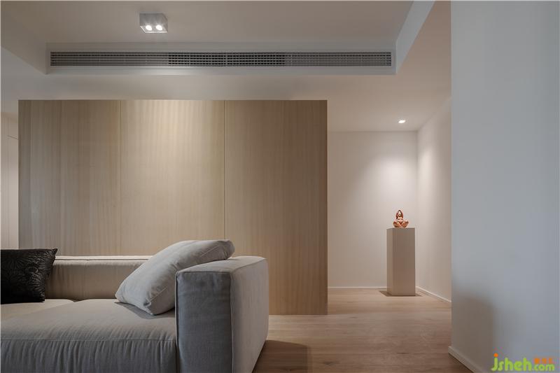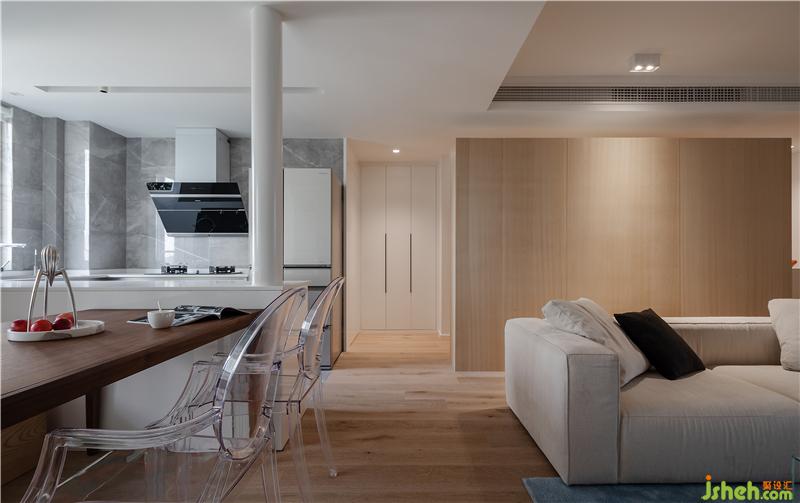 2、这套房子建筑面积为135㎡,尽管因为层高与户型的缘故,实际得房率并不算高,但其内部装修标准却足以与大型别墅公寓比肩,中央空间、新风、净水等系统兼备,因此空间可以说每寸必争。走过玄关,品承设计团队在客卫区域依然将空间利用率提升至最大化,客卫墙角一组柜子将净化水等设备隐藏起来,同时上面可做收纳,下面可为储存,视觉上干净清爽,功能上丰富实用。
