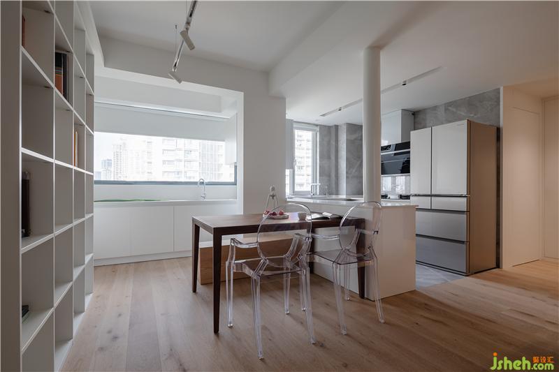 3、厨房采用完全敞开式的设计,橱柜在加长延伸出来以后,既是橱柜也是和餐厅相连接的导台,满足作为过渡区、西餐区、吧台区等多重又复杂的使用需求。其中,矗立柜面上的圆管为生活排水所用,无法人为移改,品承设计团队在对其处理上使用了偏建筑的手法,尊重它的既有存在,但对管子进行精致的外部包裹,从而让它本身成为建筑构架的一部分。