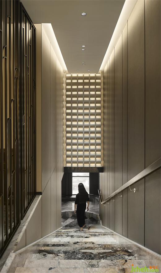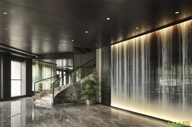 水,万物之本源,诸生之生命。瀑布飞流直下,与灯光交织,徐州酒店设计给空间增加灵秀之气,且延续了空间水元素主题。大理石乱中有序的肌理经过抛光后润滑明亮,颇有水墨画的意境。
