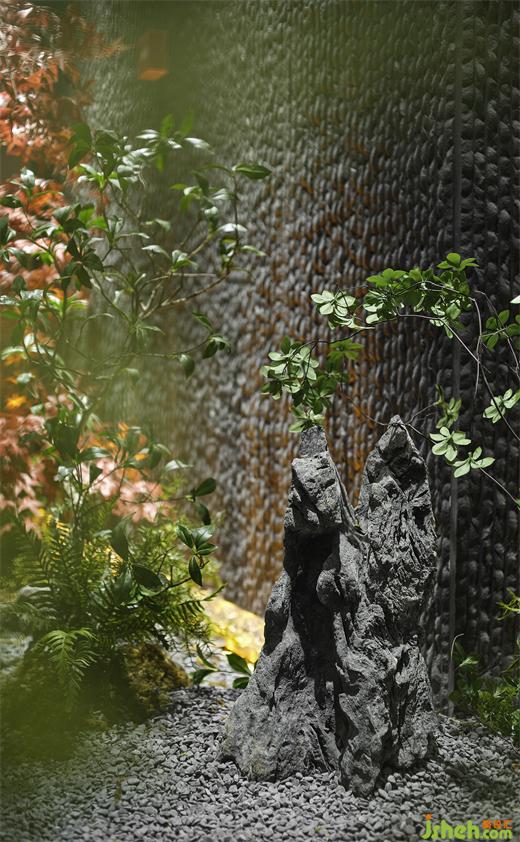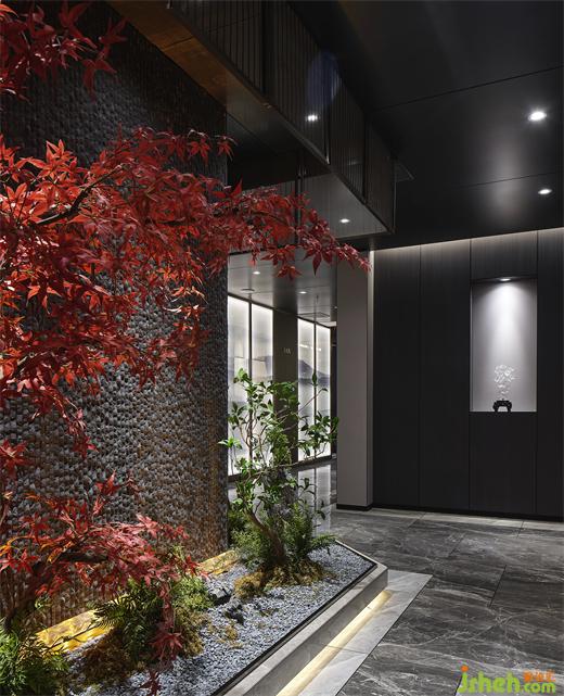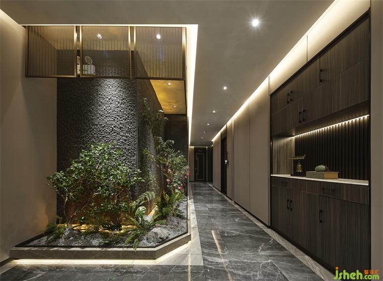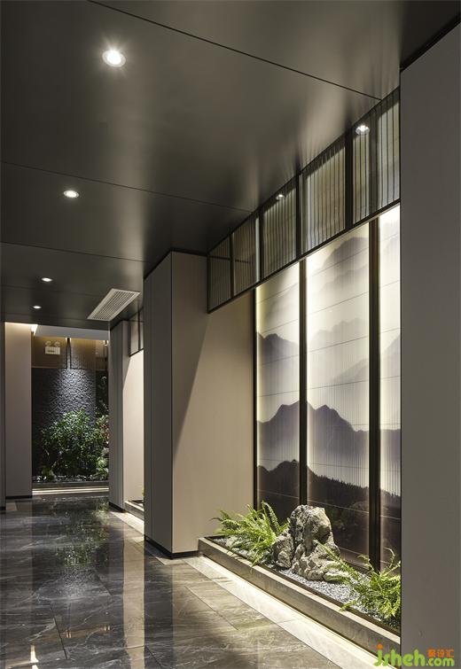 徐州酒店设计师基于对自然与空间的设计情感,结合极简东方调性,将自然元素及景观纳入室内空间,通过光、水纹灯、树、石之间的相互融合,创造了空间鳞次栉比的纵向层次。从而营造出一步一景的空间层次关系,映入眼帘,满眼绿意,带来舒适自然的气息。