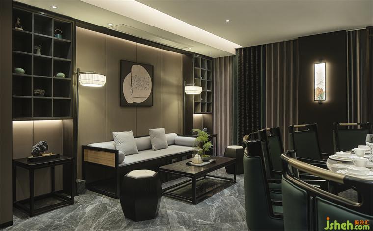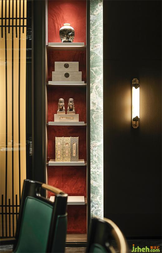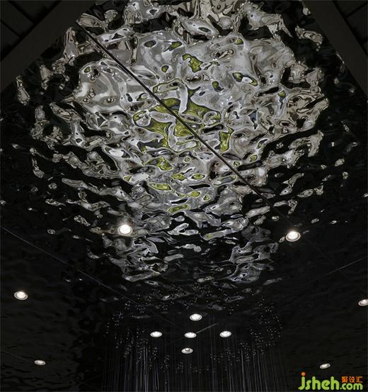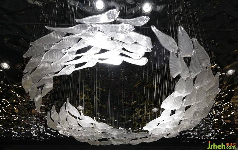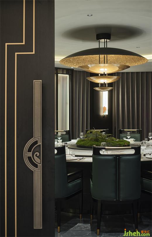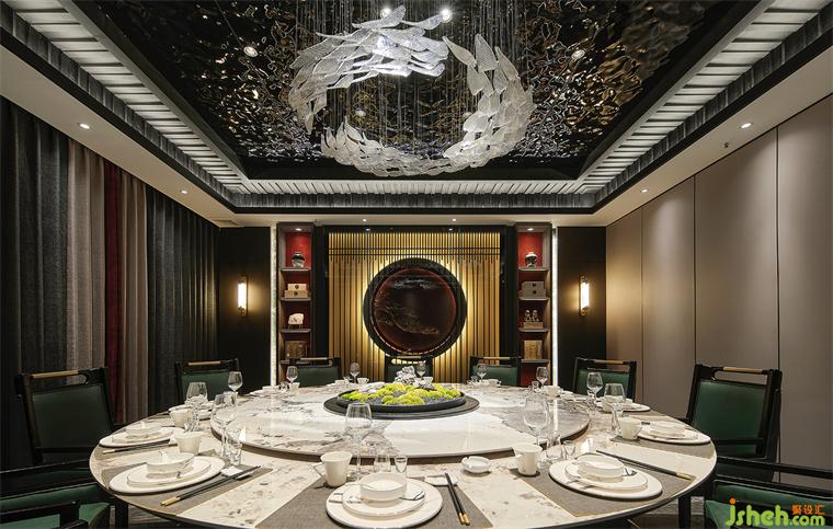 顶面水波纹板是对水形态的完美延续,结合鱼群水晶吊灯,就像置身海洋深处,望向有阳光的水面,温暖而放松的韵律感。绿色苔藓,绿色餐椅,更是将自然置景,徐州酒店设计扩充整个空间的生命力,有着雅致舒适的就餐氛围。