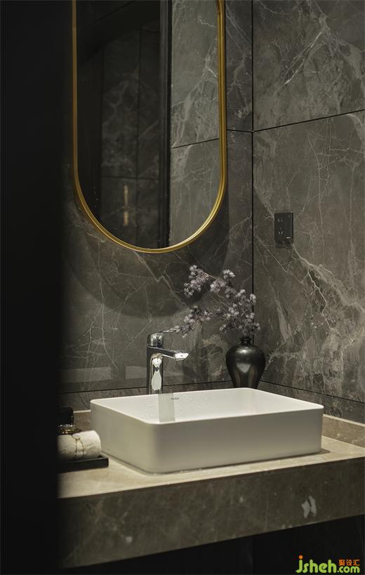 卫生间采用大理石与金属的冷暖对比凸显雅致,陶瓷花瓶配以低垂的松柏,迎接着客人的到来,整体氛围低调内敛。