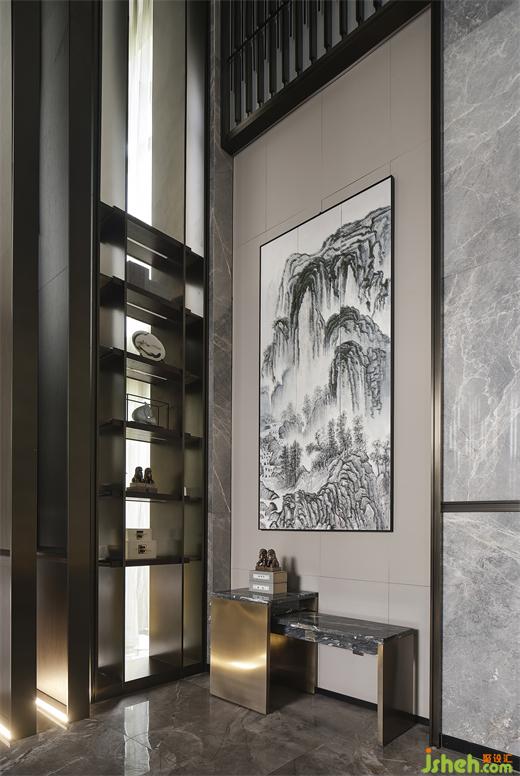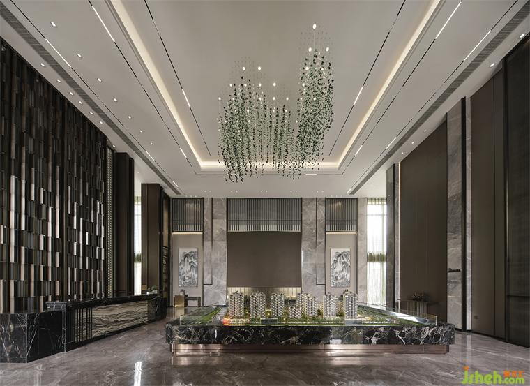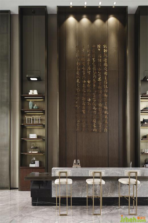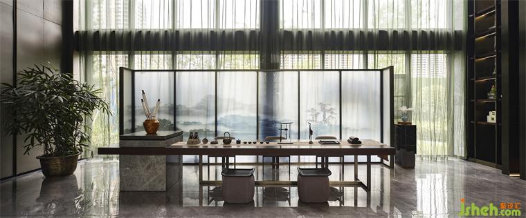 水墨屏风装置的设计,是大堂的一大亮点,营销中心设计不仅将空间做了一个完美分割,还增强了空间层次感。