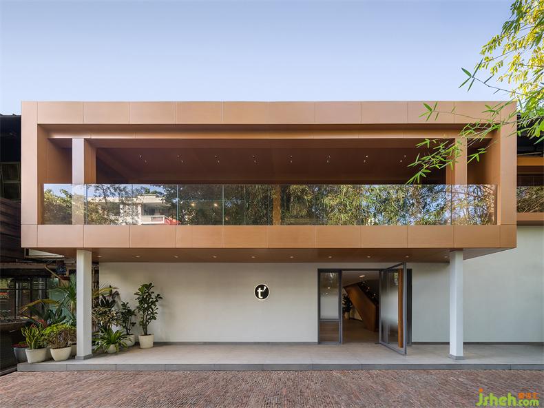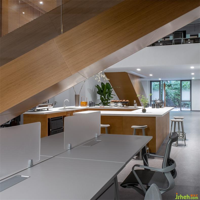 在二层置入两个木色盒子,提供一个让建筑、人与自然交互的接触面。办公室设计一个盒子平行于建筑面宽,提升颜值充当阳台;另一个盒子与之垂直,独立存在于室内空间,通过俩端的开窗联通室内外,形成自然和室内的对话,用于分享灵感和沟通讨论。
