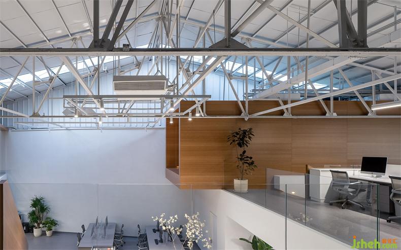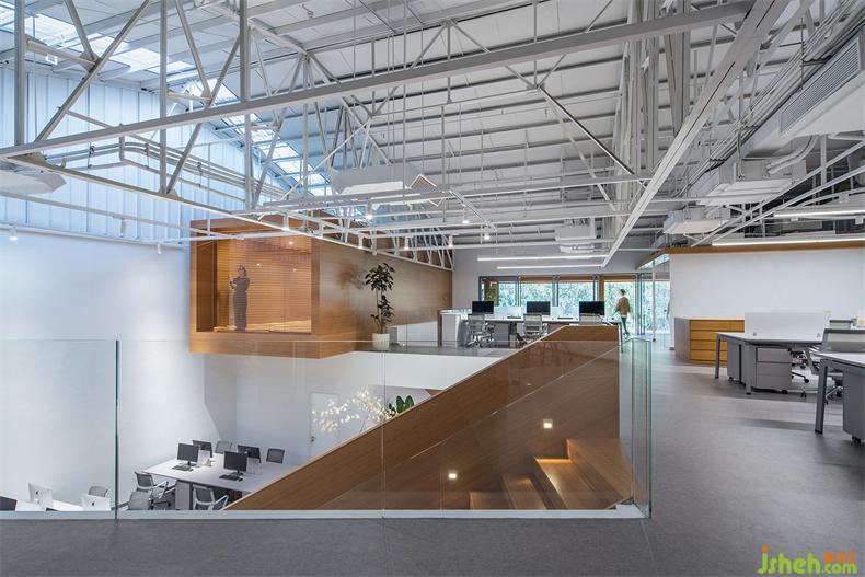 普悦设计最大限度地保留了原建筑结构,办公室设计是对历史的回望和尊重。屋顶的改造打开一部分天窗,引入的自然采光勾勒出屋梁钢结构富有几何节奏的线条。光影随着时间而变,犹如在面向未来时,那些非确定性所带来的特别体验。