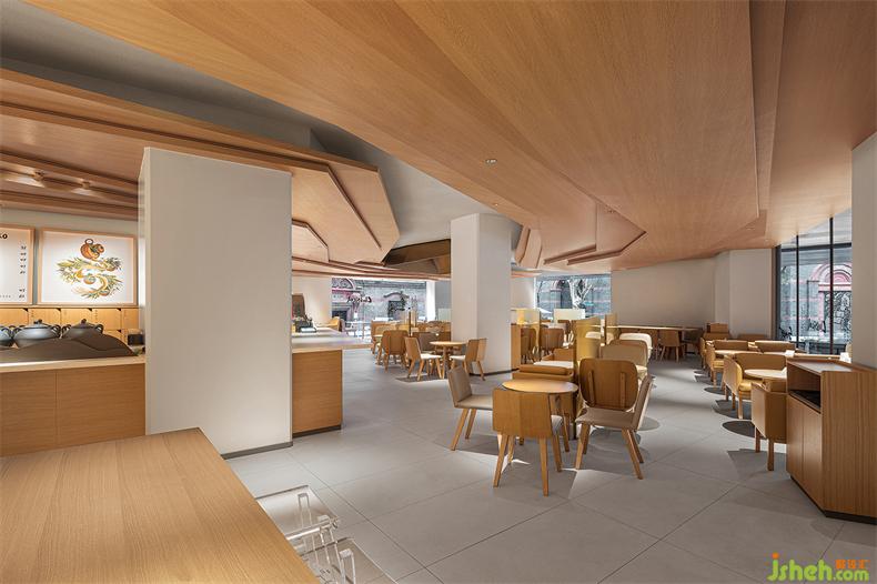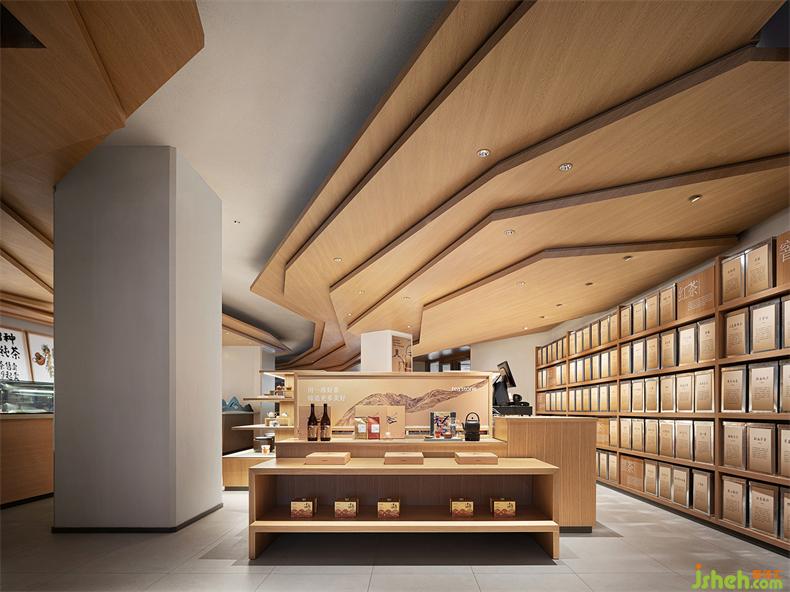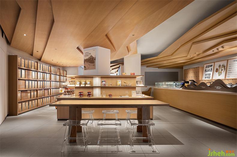 “峡湾之心”位于东面的视觉中线上。沿此中线分别设置冲泡吧台及操作区、餐厅设计茶仓和展示区,透过窗口向外展开,如同一出舞台,时刻吸引着人们的注意。