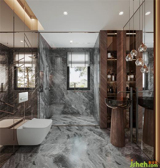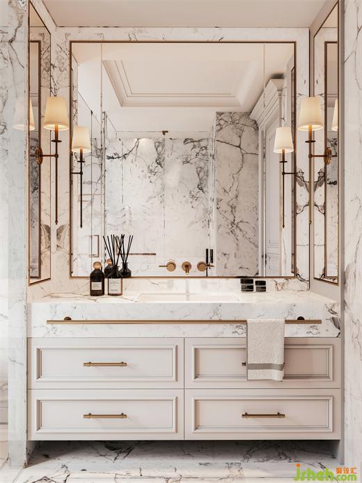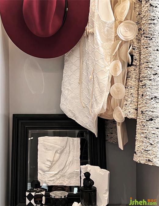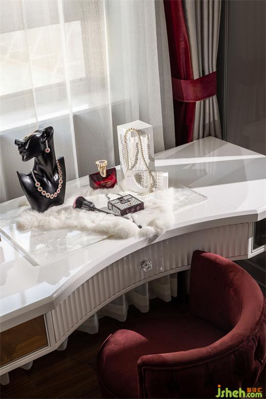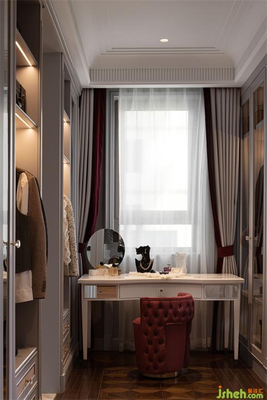 样板房设计利用从主卧前厅到达主卧的通行空间,设置一个步入式的衣帽间,视觉的落点,是高光漆的梳妆台,勃艮第红在此被强调,光影在此流转。从传承人文情怀到深谙奢华,设计师总能使用线条、材质和颜色,将法式风格、女性柔美、和现代优雅融会贯通。