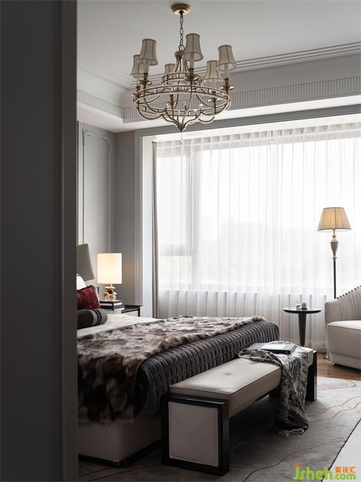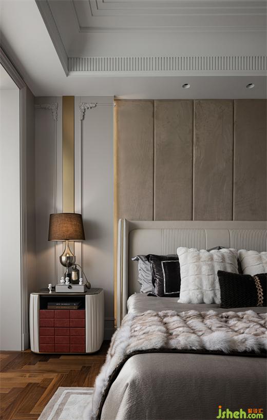 次卧室精细雅致的雕花线角、细节处的金属与皮革、不同的纹理拼接、素雅织物与奢华皮草的结合,样板房设计让次卧在沉静平稳的底色中泛出丰盈的、富有层次的雅致细节,对生活品质有着相当追求的人,自然处处用心对待。