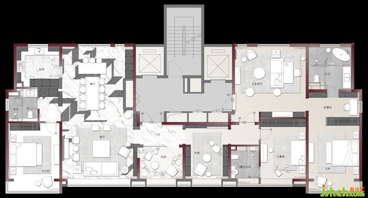 晨霭始与夕阳暮,同样是整个空间动线中交汇之处的花间堂被格调之境的红烛点亮。样板房设计花深日迟、香气拍人、锁忆春寂,修得一室热闹与一室清雅;因守极简是为修心,修热闹亦是。