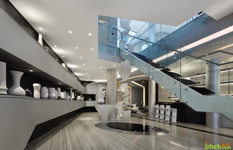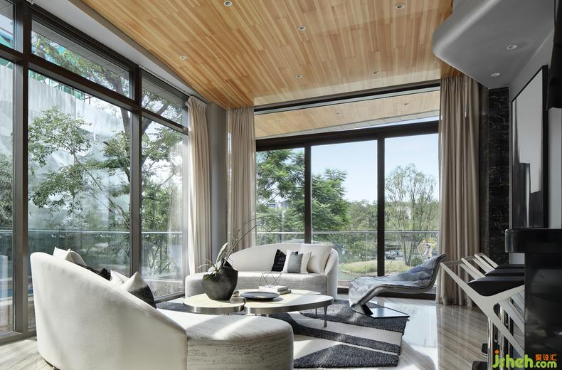 温暖的木质天花,白色几何墙面的斑驳光影,柔软而慵懒的沙发,别墅装饰木色与黑白的碰撞,确保了整体的开阔及艺术张力,碰撞出情绪化而当代性的空间。