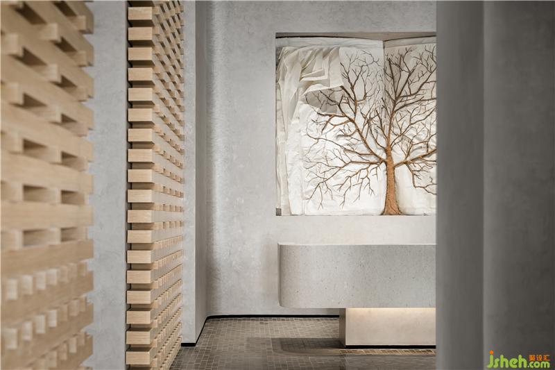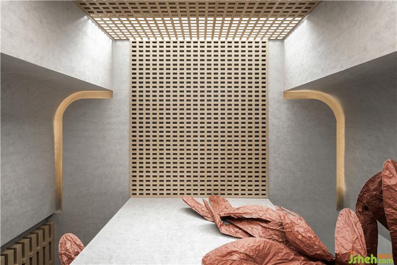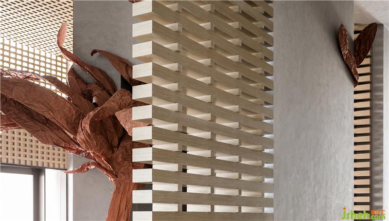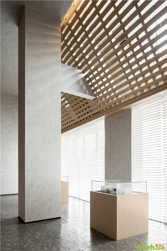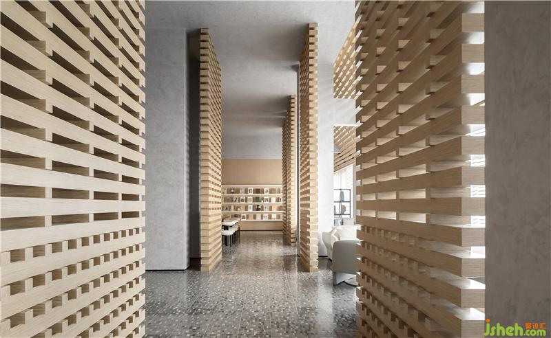 层层向上叠加式的木格栅也传递出“累积”及“向上”的精神。同时也满足墙体的围合功能,具有充分的通透性,也带来功能空间效率与气质的全新可塑性。何处舒展、何处紧凑、何处过渡、何处延伸,何处功能为重,何处铺排视觉,自由度大为拓展。
