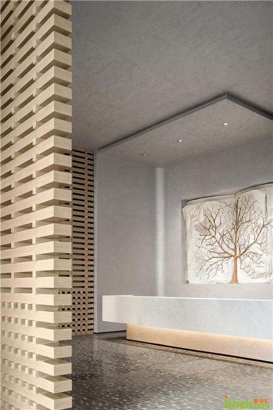 动线划分功能、引导路径,在体量不大的售楼处,动线设计还须处理开放与私密、亲近感与距离感的平衡问题,以及更重要的,基于以人为度量的尺度问题。不同的尺度引发不同的情感认知,而本案的尺度在于微妙的住宅居所尺度熟悉感,柒点设计为本案量身定制设计的大型木质格栅的系统应用成为解决方案。