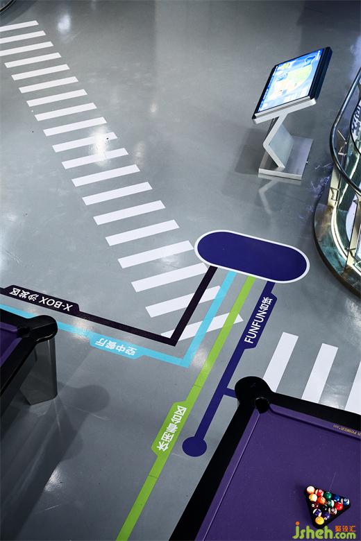 保龄球场大面积地使用凉爽的蓝色和紫色线霓虹灯,使空间更富有电子科技感。The bowling alley uses cool blue and purple line neon lights in a large area, making the space more electronic and technological.