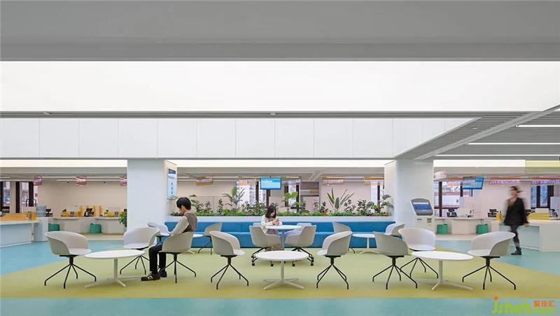 我们提出市民服务大厅的改造策略是:大厅小型化,在保持原有空间结构的基础上,通过灯光、导视系统和空间色彩将不同的办事单元串联在一起。同时办事大厅小型化让空间尺度更加亲人,为市民们在办事大厅等候或者办理业务营造一种在家的亲切感。