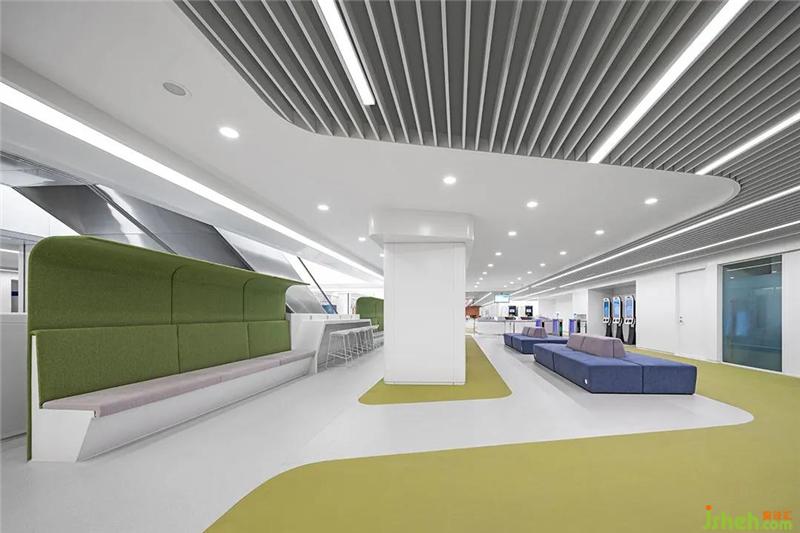 材料及品牌:烤瓷铝板、木纹转印铝板、PVC编制地毯、塑胶地板、铝格栅